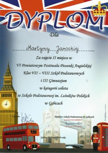 Miło nam poinformować, iż Martyna Jarocka uzyskała II miejsce w swojej kategorii wiekowej.. Wszyscy uczestnicy konkursu otrzymali nagrody i drobne upominki na pamiątkę wspólnego śpiewania. Martynie gratulujemy i życzymy dalszych sukcesów wokalnych.