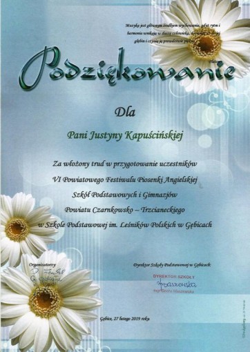 27 lutego 2019 r. Szkoła Podstawowa w Gębicach im Leśników Polskich zgromadziła uczniów z powiatu czarnkowsko - trzcianeckiego uzdolnionych nie tylko muzycznie, ale i językowo. Odbył się tam VI Powiatowy Festiwal Piosenki Angielskiej, tym razem w kategoriach 1-3, 4-6 oraz klas 7-8 szkoły podstawowej i III gimnazjalnej.