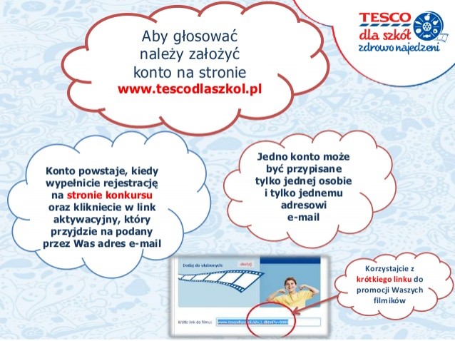 1. Zarejestruj konto. Żeby głosować, trzeba mieć założone konto na stronie www.tescodlaszkol.pl i być do niego zalogowanym. Rejestracja konta jest prosta: wystarczy podać swoje imię i nazwisko, adres e-mail, datę urodzenia i wybrany ‘nick’, czyli nazwę lub pseudonim, pod jakim będziecie widoczni na stronie. Kto ma mniej niż 18 lat, musi oczywiście potwierdzić, że ma zgodę rodziców! Po założeniu konta na podany adres e-mail przyjdzie wiadomość z linkiem aktywacyjnym – dopiero po jego kliknięciu można ustawić hasło do konta, pamiętając, żeby miało przynajmniej 8 znaków i zawierało co najmniej 1 cyfrę.