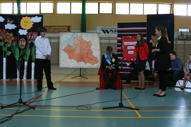 6 maja 2013 r. odbył się uroczysty apel z okazji 222. rocznicy uchwalenia Konstytucji 3 Maja. Uroczystość upamiętniła ważne wydarzenie w historii naszego kraju. Mogliśmy przypomnieć sobie okoliczności oraz przebieg tego zdarzenia. Uczniowie w części artystycznej przedstawili nam fakty z nią związane: Konstytucja z 1791 roku miała na celu zachowanie całości oraz niezależności państwa, wzmacniała działalność władzy państwowej. Sejm uwolniono od liberum veto, wolnej elekcji, zwiększono liczbę wojska, nadano prawa miastom i mieszczanom. W części artystycznej nie zabrakło małych form teatralnych (scena rozbioru Polski oraz wywiad z ostatnim królem Rzeczpospolitej - Stanisławem Augustem Poniatowskim), pieśni okolicznościowych oraz recytacji. Wszystko to na tle dekoracji przygotowanych pod kierunkiem p. Magdaleny Niedźwieckiej. Całość przedstawili uczniowie klas pierwszych i drugich pod kierunkiem p. Ewy Kowal, p. Ludmiły Wicher oraz p. Justyny Kapuścińskiej.