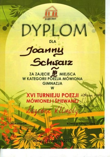 Wiosna sprzyja recytatorom. Gimnazjaliści z Krzyża brali dotąd udział w trzech konkursach pozaszkolnych. 08.03.2013 w XI Konkursie Recytatorskim Poezji Oflagu III c Woldenberg w Dobiegniewie (wyróżnienia zdobyły tu Katarzyna Smolińska 3c i Julia Koczerba 1c), 22.03.2013 w XXVIII Wojewódzkim Konkursie Recytatorskim Szkół Podstawowych i Gimnazjów w Poznaniu i w Powiatowym Konkursie Poezji Mówionej i Śpiewanej „Łagodne Klimaty” w Wieleniu ( tu III miejsce Joanny Schwarz w kategorii gimnazjalistów). Cieszy, że wciąż znajdują się uczniowie, którzy chcą i potrafią pięknie recytować niełatwe często utwory. Gratulujemy!