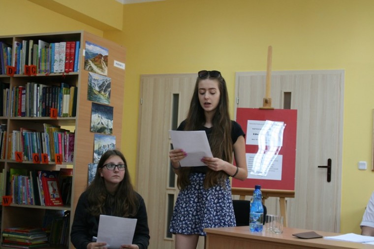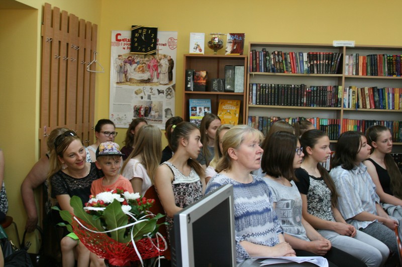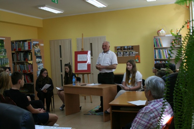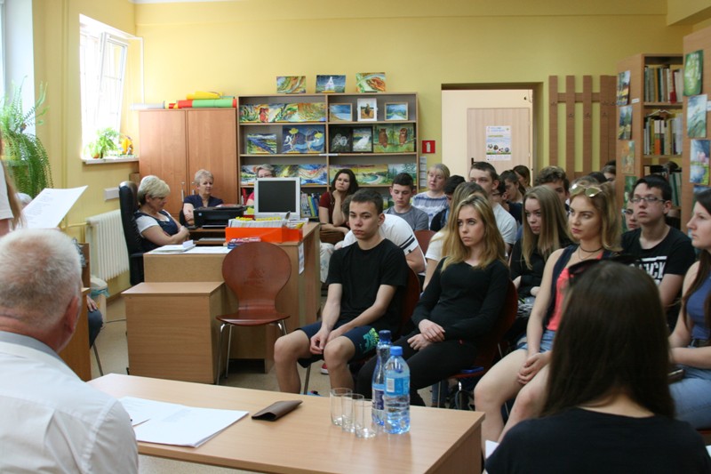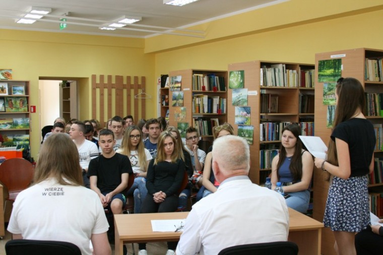 Po prezentacji poeta zaprezentował swój utwór na powitanie, a następnie wolontariuszki z kl.2a gimnazjum i kl. 1LO czytały wybrane przez gościa teksty. Mieliśmy okazję poznać główne tematy poruszane w tej bogatej już, choć nieznanej szerzej twórczości. Piękno przyrody, zmienność pór roku, przemijanie życia i marzeń, miłość – te motywy pojawiały się najczęściej, także w kolejnych „wierszach wybranych”. Te czytał już sam poeta i komentował we właściwy sobie sposób. Spotkanie, zaplanowane na godzinę lekcyjną, potrwało dwie, głównie za sprawą p. Emilii Gniatkiewicz- Lewkowicz, która poddała wiersze życzliwej i wnikliwej, polonistycznej analizie. Zgromadzona na widowni młodzież kl. 2 i 3 gimnazjum miała okazję uczestniczyć w prawdziwej, żywej lekcji interpretacji poezji oraz wysłuchać odpowiedzi ich autora, a ten przywilej zdarza się nielicznym. To było bardzo cenne i udane spotkanie.