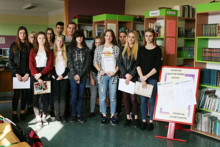 Po utwory z kilku tomików sięgnęło trzynaścioro uczniów Zespołu Szkół Ogólnokształcących, którzy wystąpili przed jury w składzie: p. Anna Bogdziewicz, p. Małgorzata Borucka – Andrzejewska, p. Jolanta Jaworska i p. Ewa Kowal oraz zgromadzoną w bibliotece szkolnej publicznością.