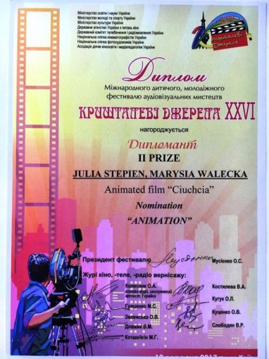Warsztaty to nie tylko praca i zabawa, ale też sukcesy. Film animowany „Nowe przygody Czerwonego Kapturka” Oli Matkowskiej, Julii Wilk i Huberta Brączkowskiego zdobył wyróżnienie na Festiwalu twórczości medialnej zorganizowanym przez Centrum Kultury „Zamek” w Poznaniu. I teraz znowu miła wiadomość – na Międzynarodowym Festiwalu twórczości medialnej młodzieży „Kryształowe źródła” w Kijowie, który odbył się we wrześniu tego roku, prace naszych młodych filmowców zdobyły nagrody.