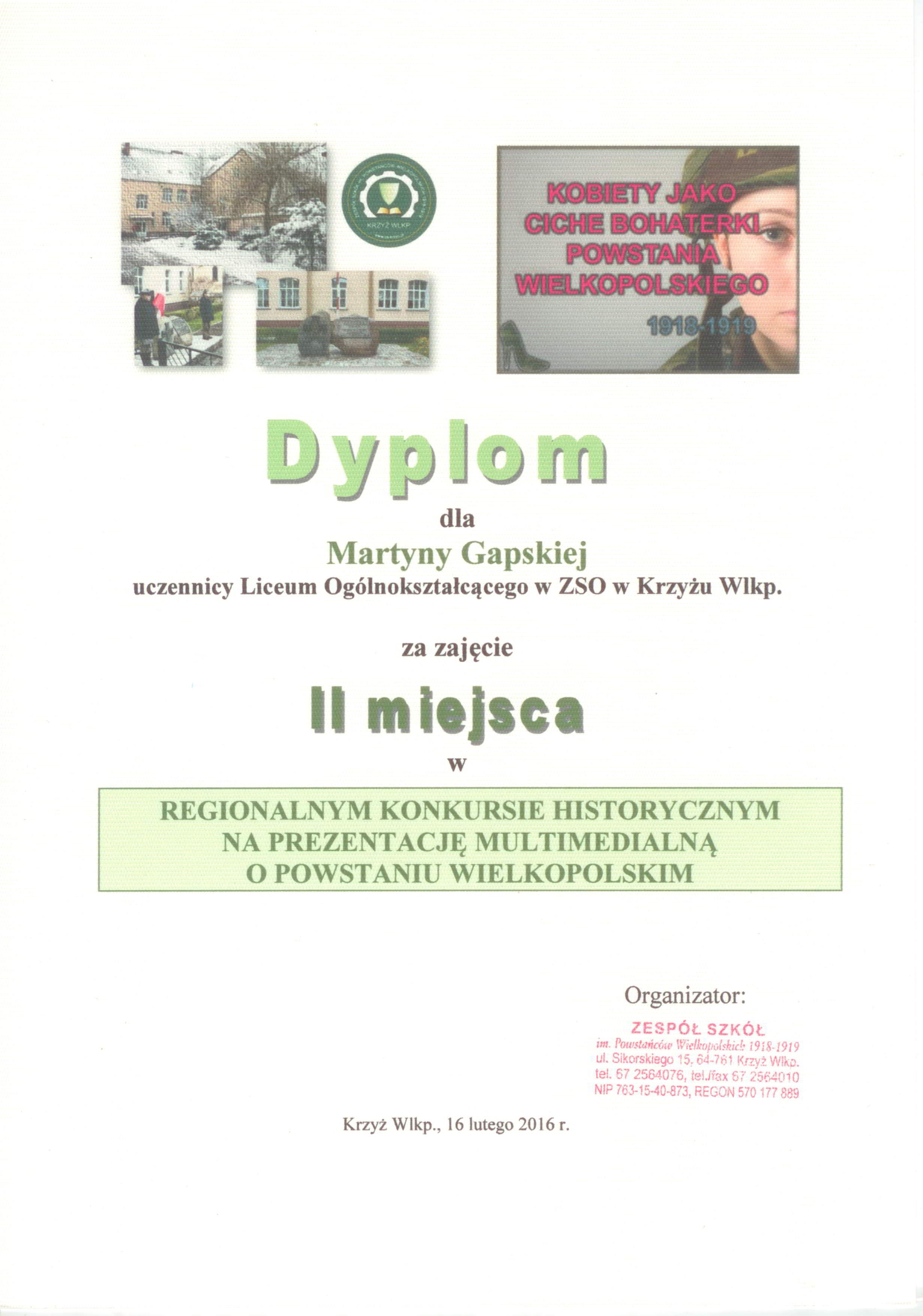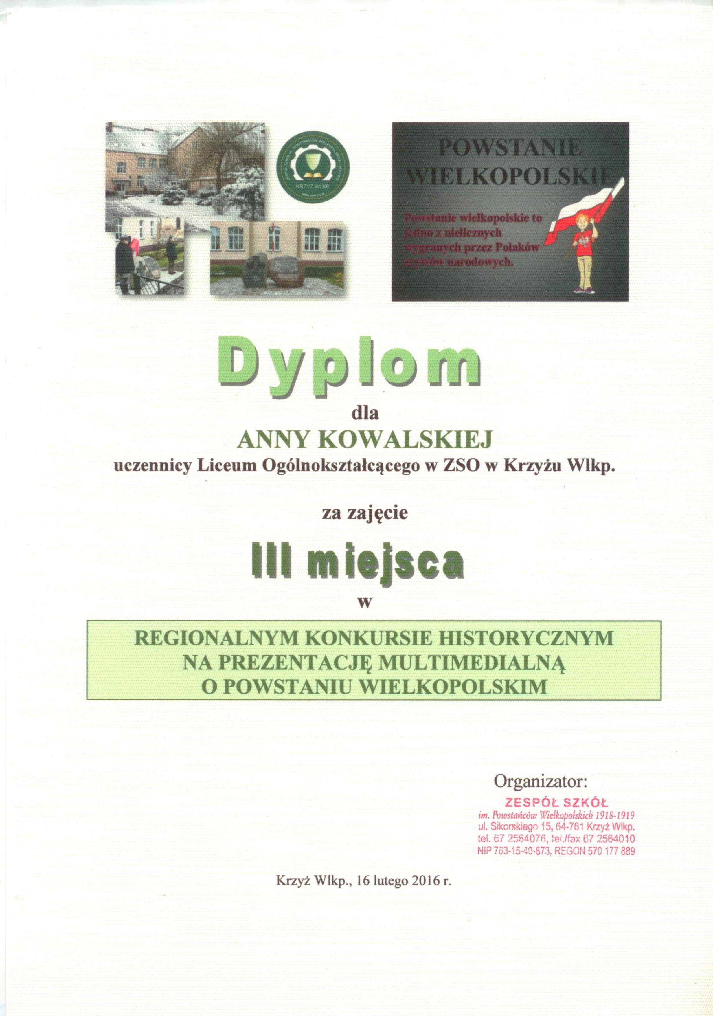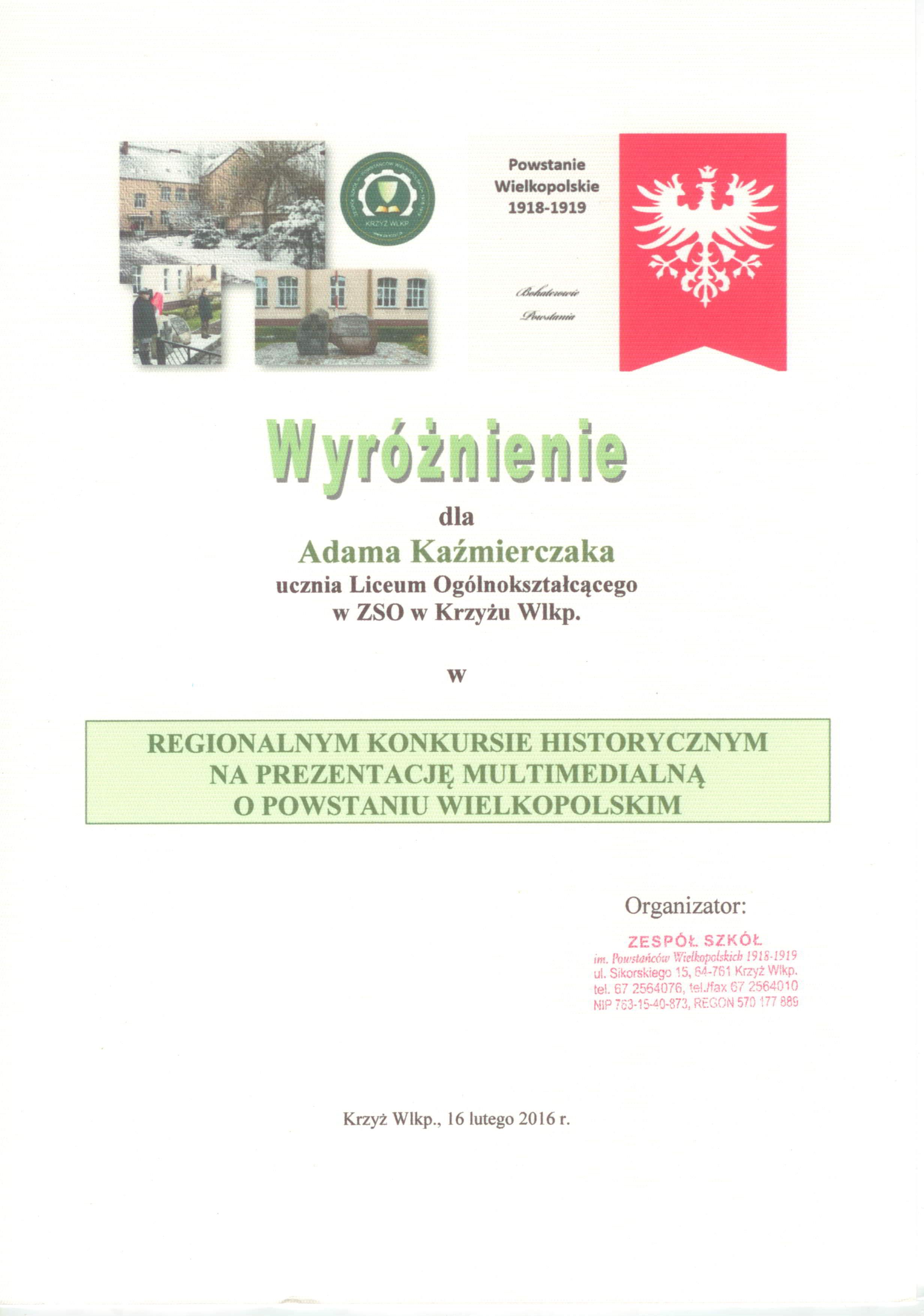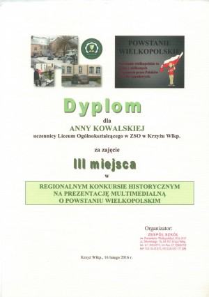 W lutym 2016 r. uczniowie Liceum Ogólnokształcącego ZSO w Krzyżu Wielkopolskim zajęli czołowe miejsca w Regionalnym Konkursie Historycznym na prezentację multimedialną o Powstaniu Wielkopolskim. Organizatorem ww. konkursu był Zespół Szkół im. Powstańców Wielkopolskich 1918 – 1919 w Krzyżu Wlkp.
