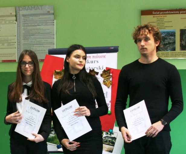 I miejsce Jan Bogdziewicz, klasa II LO; II miejsce Weronika Michałek, klasa II LO; III miejsce Martyna Musiał, klasa I LO.