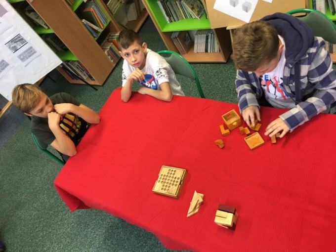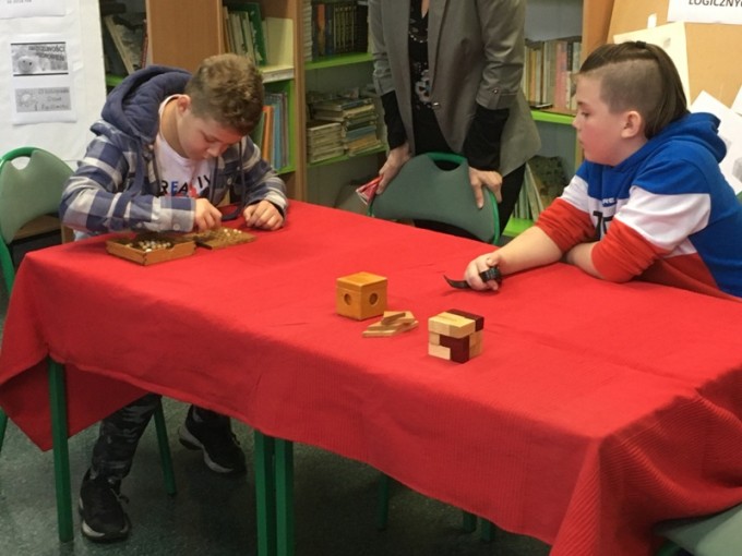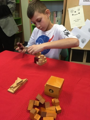 Zadanie konkursowe polegało na ułożeniu w jak najkrótszym czasie 4 układanek: sześcian w pudełku, sześcian otwarty, literka T z 4 elementów oraz pudełko z kulkami. Walka o tytuł mistrza układanek logicznych była zacięta, wyrównana i pełna niespodzianek. Mistrzem układanek logicznych 2019 został Jakub Wiśniewski uczeń klasy VII b. Gratulujemy!!!